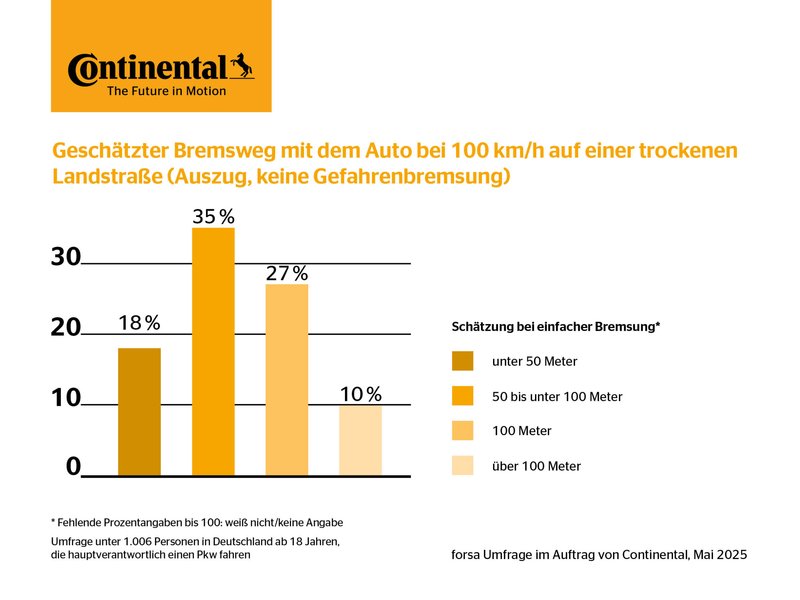 Continental und Forsa befragten rund 1.000 deutsche Fahrer:innen zum Bremsweg bei 100 km/h auf trockener Landstraße. Ergebnis: 53 % tippten unter 100 Metern – Durchschnittswert: nur knapp 80 Meter. Die Befragen unterschätzten den tatsächlichen Bremsweg also um etwa 20 Meter – das ist fast die Länge von vier Autos.